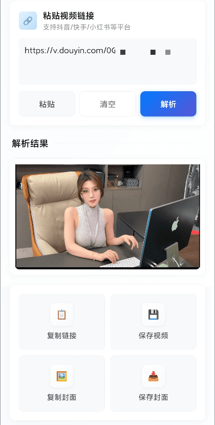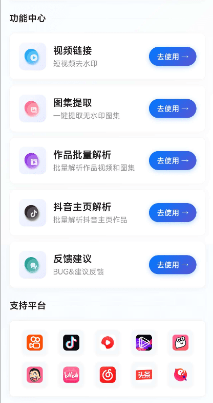 支持:快手,抖音,小红书,哔哩哔哩,皮皮虾,等多款应用去水印,支持图集解析批量下载